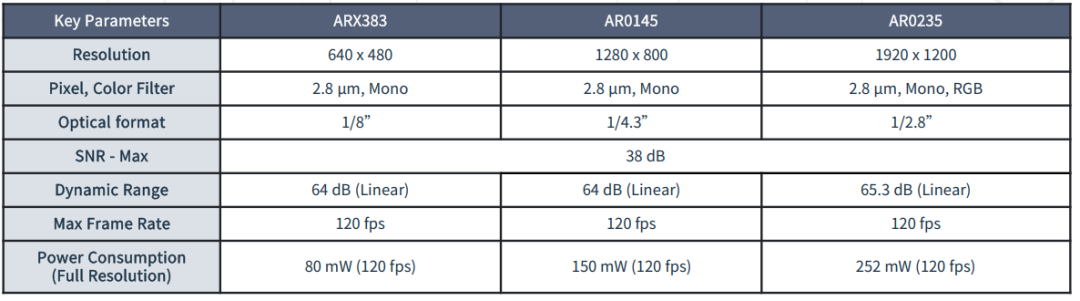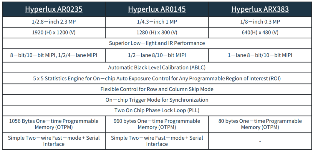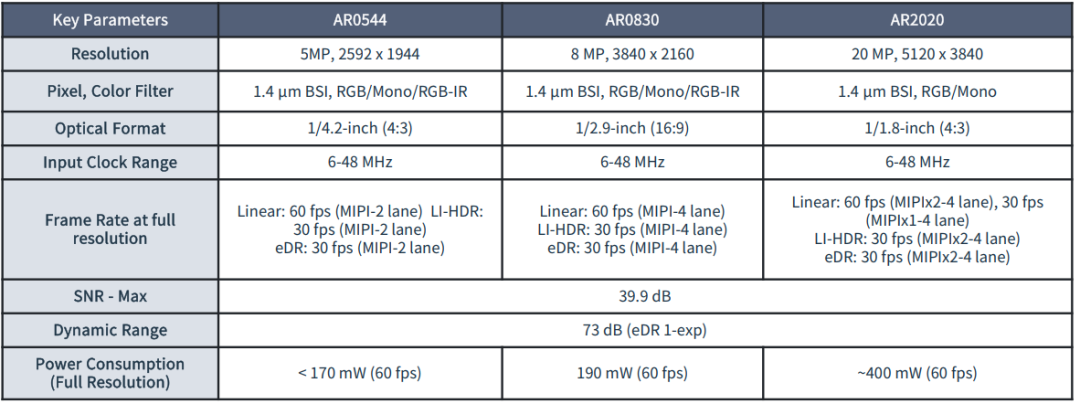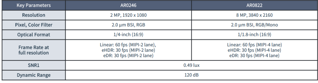 ● 800 万像素 CMOS 传感器,降低成本,包含三种产品型号: 500万像素的 AR0544、可在ISP芯片中实现HDR处理(eDR)